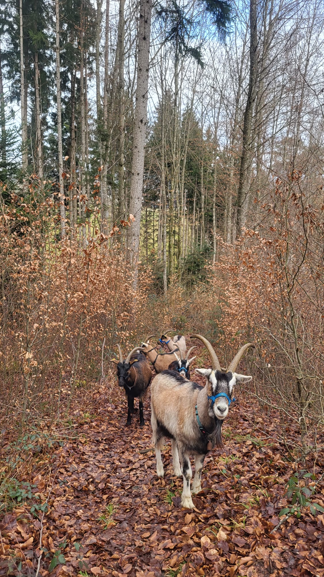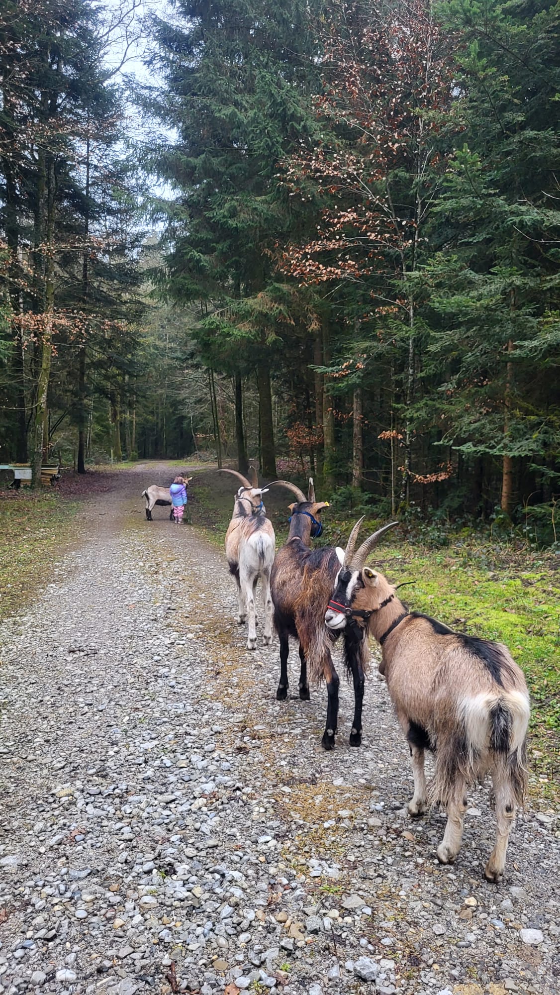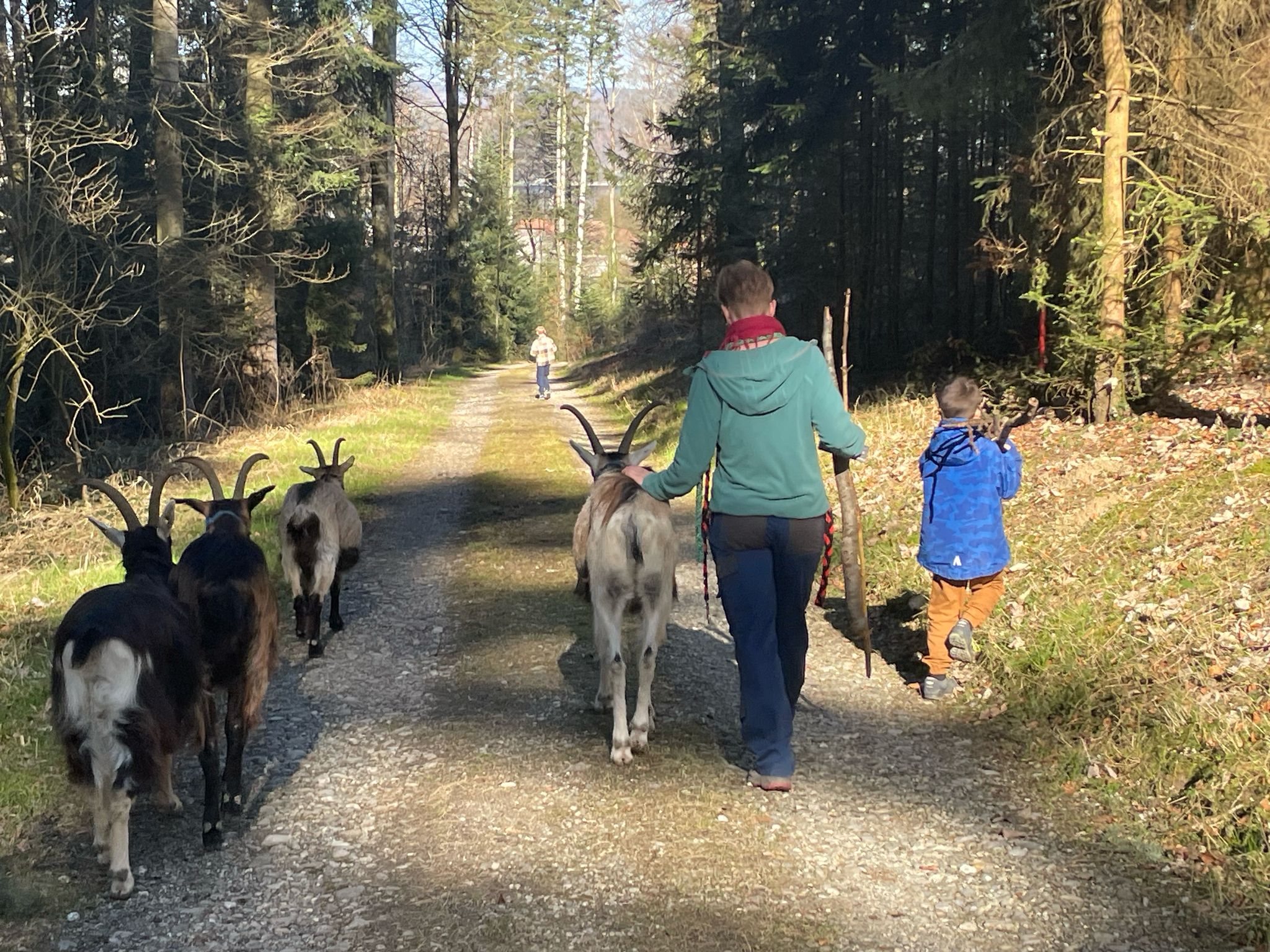 Anschließend machen wir einen gemütlichen Spaziergang in den Wald. Dabei geht es nicht um Schnelligkeit – wir passen uns dem Tempo der Ziegen an, beobachten sie in ihrer Umgebung und erleben gemeinsam ein kleines Abenteuer in der Natur.