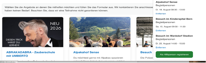 Drückt den Helfen-Button oben rechts. Es erscheinen alle Angebote, bei welchen wir auf Begleitpersonen angewiesen sind.