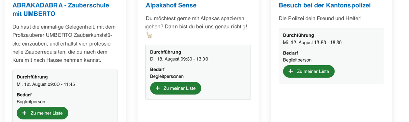Hier könnt Ihr alle Angebote auswählen, die Ihr begleiten möchtet, in dem Ihr auf «Zu meiner Liste» klickt.